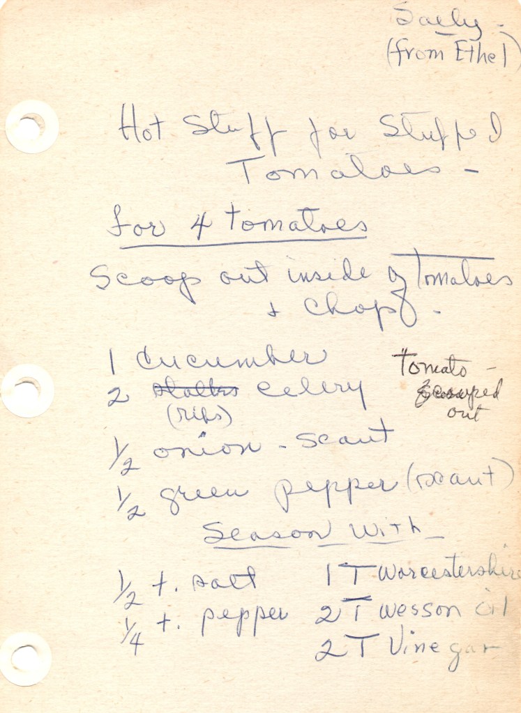 I admired the determination and love she showed as she prepared Sadie’s favorites out of the two cookbooks Sadie owned. In Sadie’s treasured Charity League Cookbook, Ethel B could find Sadie’s scrawled notes by recipes with her version of how they should be prepared. And Kitchen Klips had an index page at the front where she listed her favorites. There were scrumptious tasty treats like Annie Maide’s Fig preserves and Miss Mary Bell’s Perfect Caramel Icing. The trick to the preserves was that you had to let the figs sit overnight in sugar. If I got wind preserves were in the making, I would promptly schedule a slumber party with Sadie so that I could sneak a few (or all) of these delicacies during the night. Then there was “Mrs. Phipott’s” favorite, Stuffed Green Peppers, handwritten on crumbling browned paper. I have my version now with tangy capers and salty olives. I am not sure if she’d be mortified or proud. Ah, but the most notable of all and not in either cookbook, is Ethel’s tomatoes. Summery goodness right out of the garden, you could feel the warmth of the sun as you ate them.